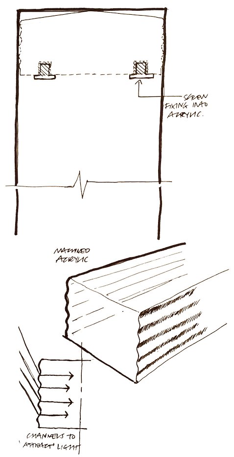 A pedestrian wayfinding system requires visibility and clarity to the public and its users. Due to the budget and infrastructural constraints there could be no electrical power to each signage unit i.e no backlighting. Thinking about light led me to look at alternative ways of creating it without power. The acrylic ‘beacons’ were developed to collect natural daylight and capture car headlight beams (if only for an instant) at night – the beacon effectively acting as an identifier in the street and sidewalks.