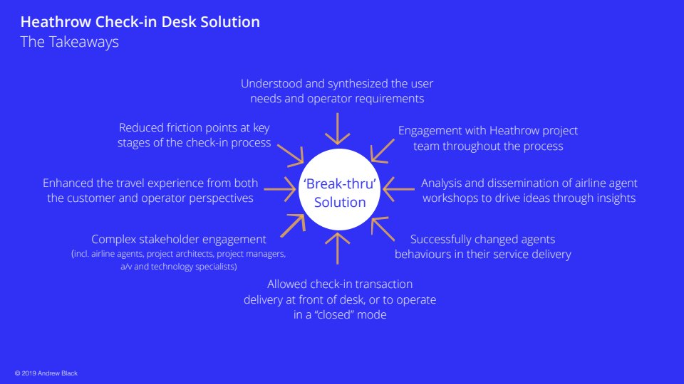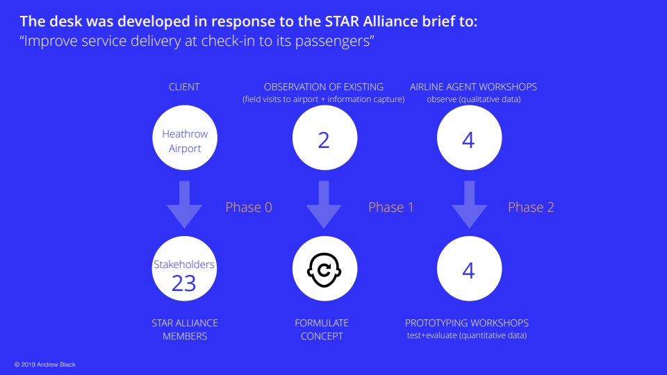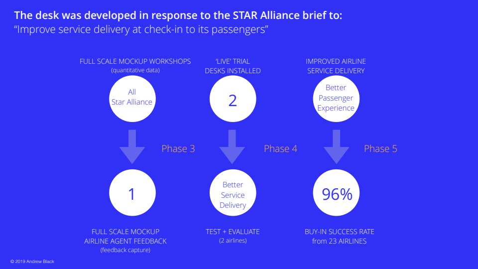The “Breakthrough” desk concept https://misterblack.co.uk/projects/6064363 removed the physical barrier between the passenger and agent, and improved the check-in transaction and experience. A live trial was conducted with airline operators at Heathrow using 2 prototype desks, followed by a full rollout installation within the Terminal.